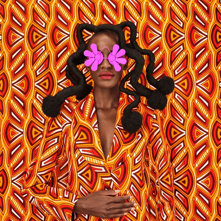 Muriu also worked with upcycled Oribe packaging from the archives to handcraft brilliant, one-of-a-kind eyewear, which pops from the patterns and echoes the model’s ornately styled hair.